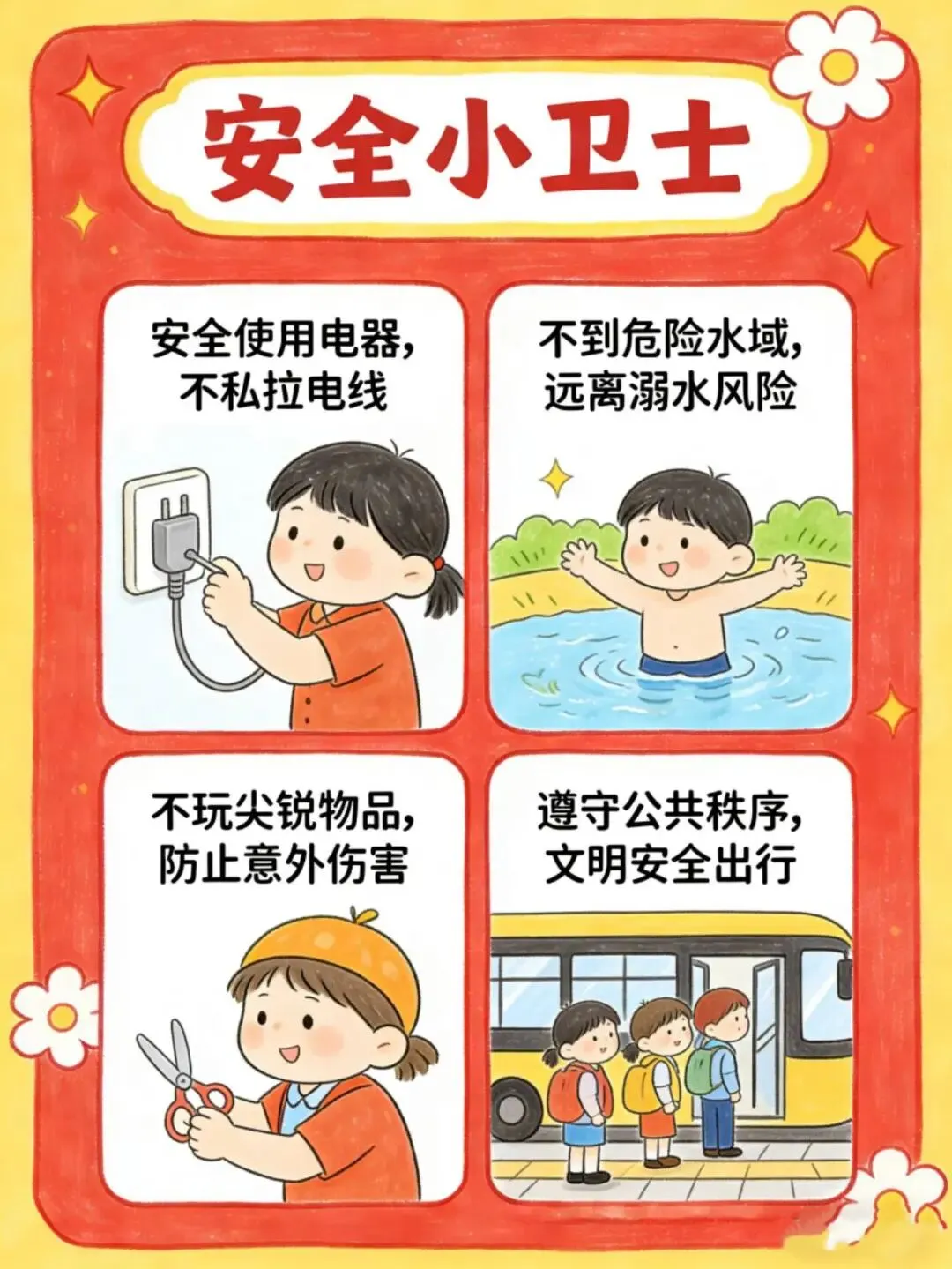 安全第一,预防为主。孩子来园前,请家长仔细检查孩子的服装和口袋,看是否有尖锐细小的潜在危险品,如小刀、药片、铁钉、小颗粒物、玻璃珠等。在家加强对孩子的安全教育,教育孩子学会必要的自我保护方法,如不触摸插座开关、不爬高、不跟陌生人走等。