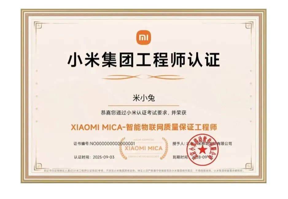 完成培训可获得小米集团工程师认证(XIAOMI MICA-智能物联网质量保证工程师),直接对接小米岗位!