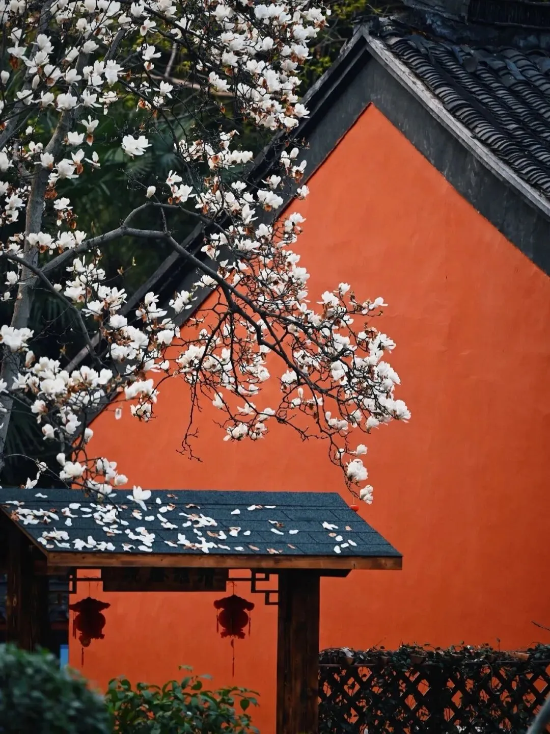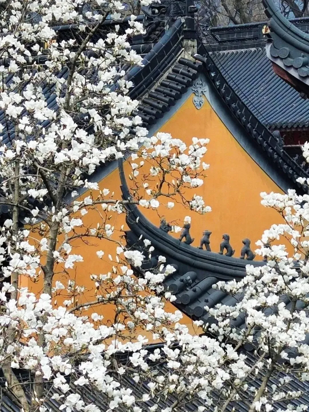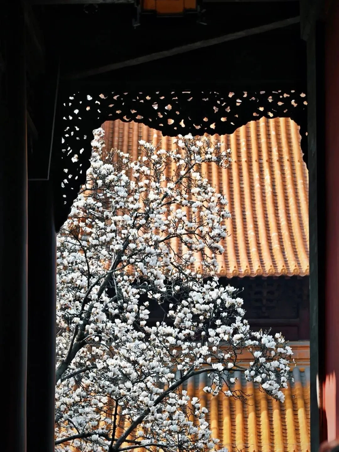 ✅灵谷寺:红墙衬着白玉兰,那份禅意和肃穆,别的花给不了,早上第一缕阳光照在花瓣上时最美