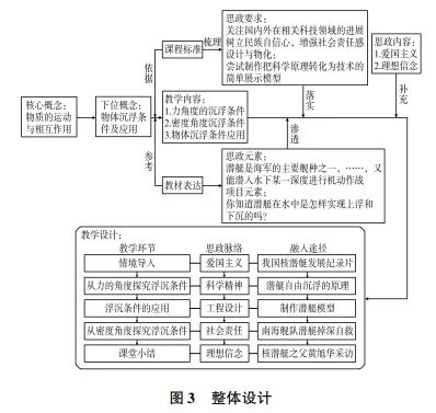 以浙教版《科学》教材八年级上册第一章第3节“水的浮力”中“物体的沉浮条件”为例,在教学实践中深挖思政元素,将思政元素渗透到真实项目情境、小组合作探究、传统文化与前沿科技、实际应用中,助力课堂教学的研究与探索,促使学生的科学学科核心素养落地,整体设计如图3所示.