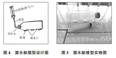 学生根据对任务的分析拟定设计图,设计潜艇制作方案,并分工实施.教师提供可参考的用于制作潜艇的材料(塑料瓶、注射器、配重硬币、吊针软管、胶带、剪刀等),启发学生思考.在项目实施过程中,教师巡回指导,分析各小组出现的问题并引导他们进行调整和修正.