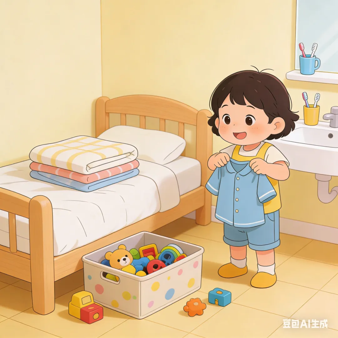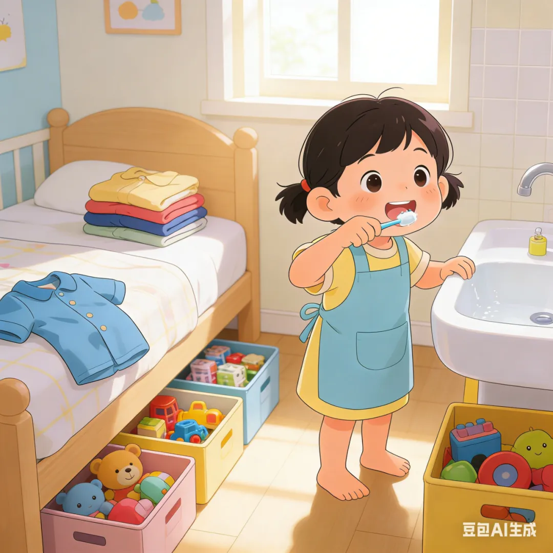 2.放手让孩子完成力所能及的小事,引导孩子自己洗漱、穿衣、整理玩具和物品;