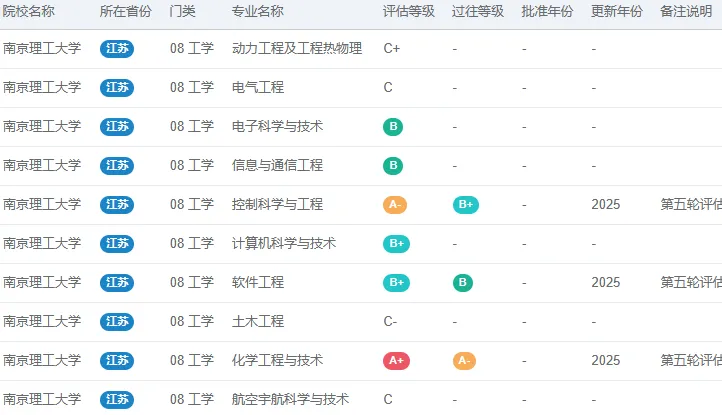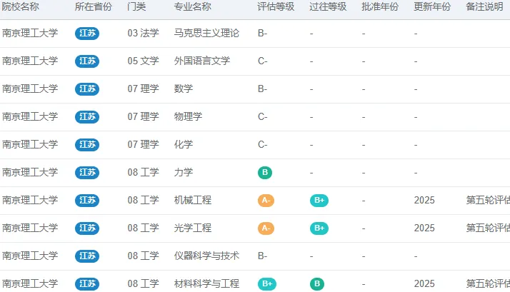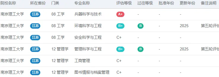 以下是根据公开信息,整理汇总的“南京理工大学”第五轮学科评估的结果,仅供参考。A+表示前2%,A表示前5%,A-表示前10%,B+表示前20%,B表示前30%,B-表示前40%,C+表示前50%,C表示前60%,C-表示前70%。更详细的学科评估信息,可以点击“阅读原文”查看,在电脑的浏览器中查看,效果更佳。