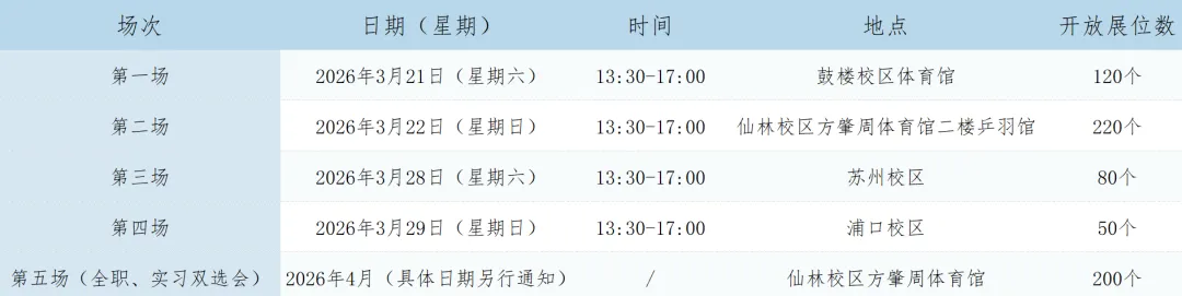 本次系列双选会共设5场(4场综合性双选会+1场全职、实习双选会),分别在南京大学鼓楼校区、仙林校区、苏州校区及浦口校区举办,具体安排如下: