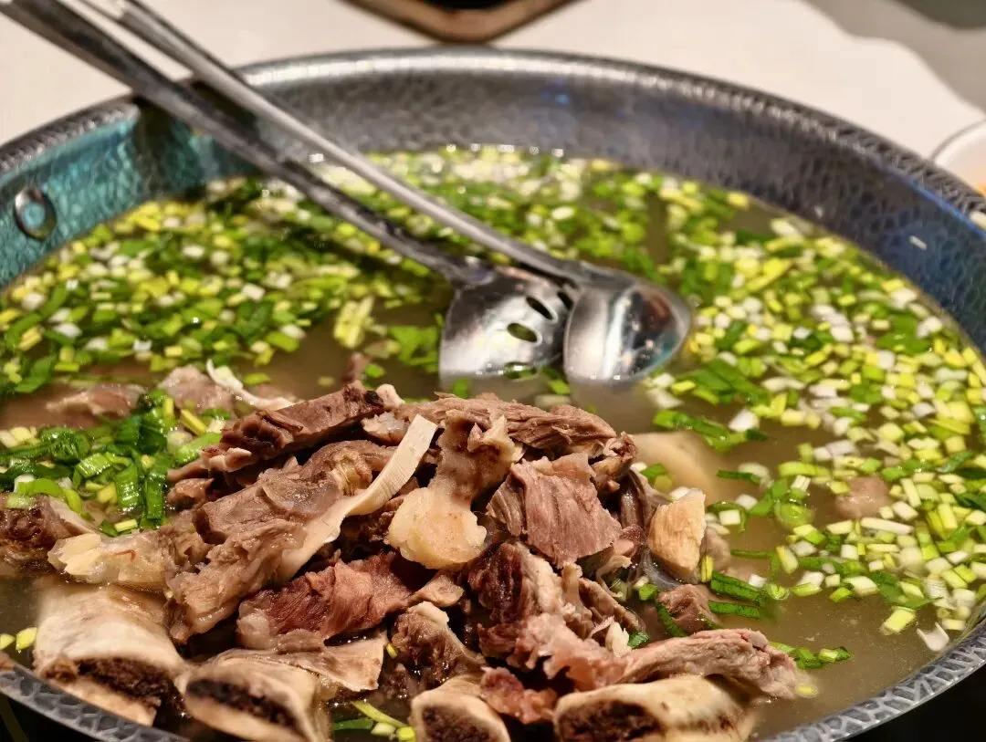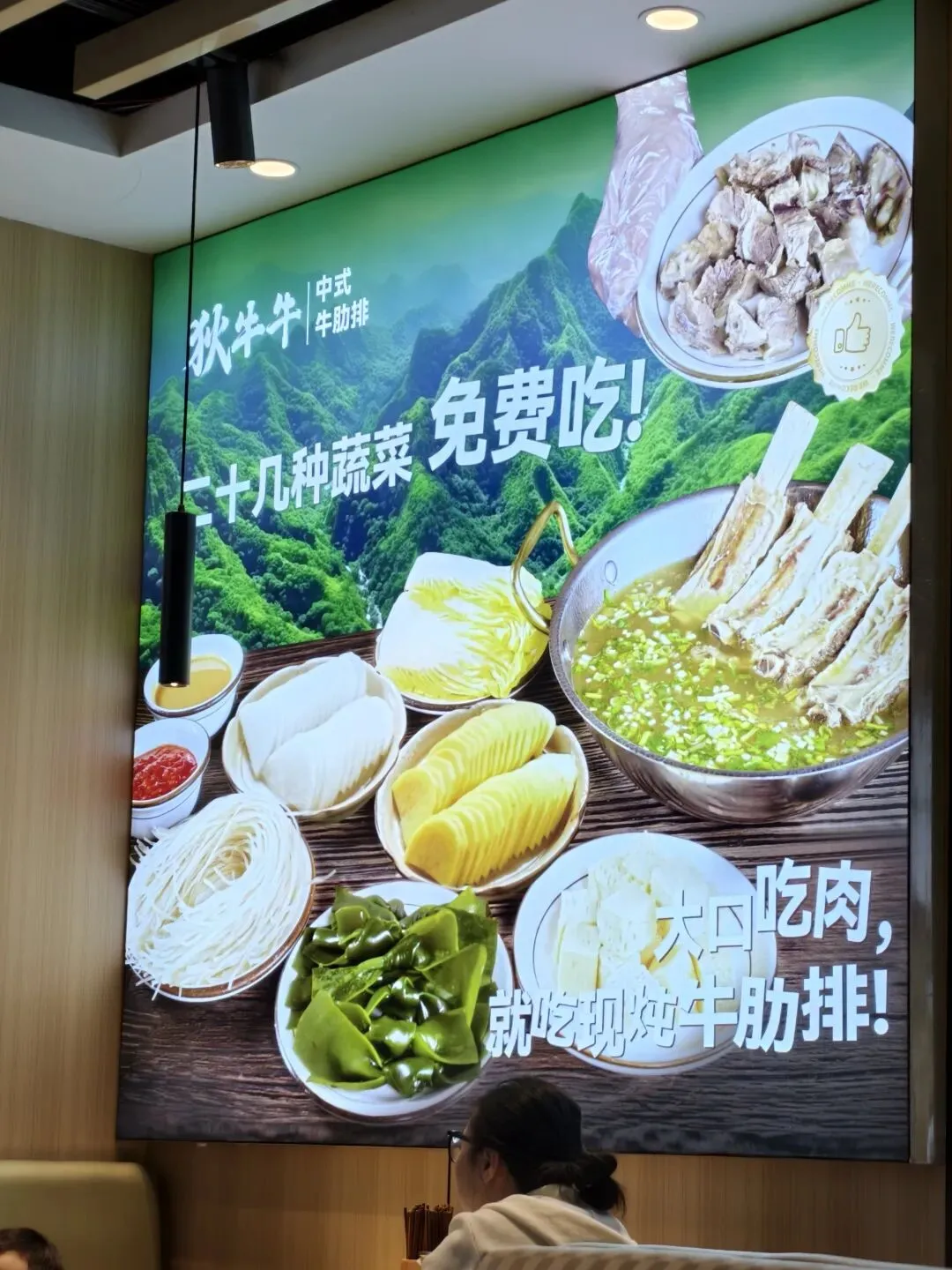 菜品:牛肉量挺多的,吃牛肋排很爽,单加一根是19,一份是68有四根。汤底也很好喝,先喝汤,再吃肉,最后涮菜。蔬菜都很新鲜,洗的很干净。自助主食的种类也挺多的,方便面、鲜面、年糕、红薯宽粉和细粉都有,面筋和豆皮也有好几种。