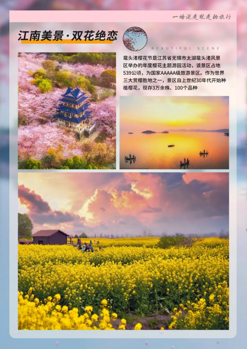 早餐后可游览【鼋头渚】(景交40/人自理)太湖鼋头渚风景区,位于江苏省无锡市,是国家重点风景名胜区,是国家AAAAA级旅游景区,于1916年始建园林,1980年后,面积达到500公顷。鼋头渚风景区为太湖西北岸无锡境内的一个半岛,三面环水,由宝界山、鹿顶山、南犊山及其附近的中犊山和三山岛等组成,形状好似浮鼋翘首。鼋头渚风景区有充山隐秀、鹿顶迎晖、鼋渚春涛、横云山庄、万浪卷雪、湖山真意、十里芳径、太湖仙岛、江南兰苑、樱花谷、无锡人杰苑及中犊晨雾、广福古寺等10多处景点。鼋头渚风景区既有山长水阔、帆影点点的自然山水画卷,有小桥流水、绿树人家的山乡田园风光,有典雅精致、古朴纯净的江南园林景致;还有吃、住、购、行等配套齐全的服务和娱乐设施,加上历代名人雅士游踪、石刻、书画、传说等诸多内涵深厚的文化积淀,构成了此地以天然山水为主、人工点缀为辅的综合性、多功能风景旅游胜地。三月的鼋头渚 ”早樱-粉色或淡粉色花朵,是此时间段的核心花景“玉兰花“ 山茶花-粉色花朵,耐寒醒目“。