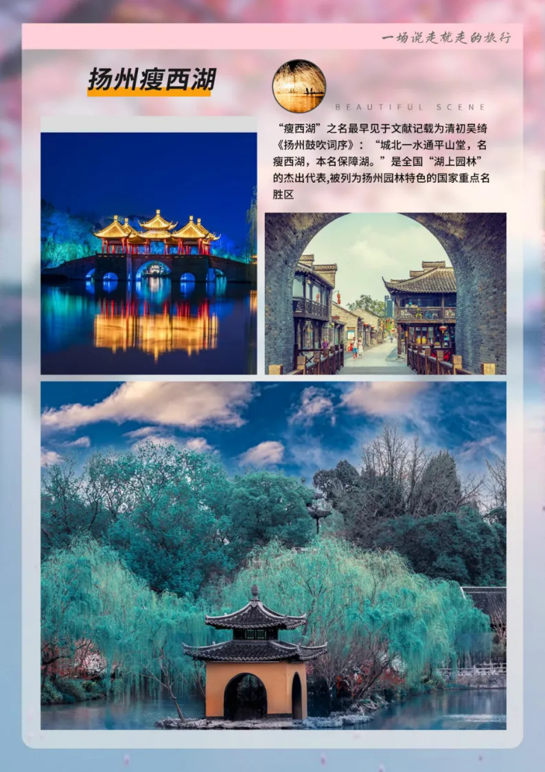 黄花机场集合出发,乘机赴“月亮之城”-扬州,导游接机可游览【瘦西湖】瘦西湖位于扬州市区西南部,是扬州八大景之一。瘦西湖面积约3.6平方公里,是一处以山水园林为主体,集人文、历史、文化、艺术于一体的风景区。瘦西湖的历史可以追溯到唐朝,当时这里是一处淤泥滩地,后来经过几代扬州知名人士的开发,逐渐变成了一片人工湖泊。明代时期,瘦西湖经过大规模的扩建,形成了今天的规模和格局。烟花三月的扬州“春梅-临水梅花倒映湖中,景色绝佳””迎春花-嫩黄色小花,点缀在湖畔、石缝间,预报春意”“玉兰花-白色或紫色玉兰,花朵硕大高雅”后车赴泰州入住酒店。参考航班:昆明航空KY3125长沙11:10--13:00扬泰。
