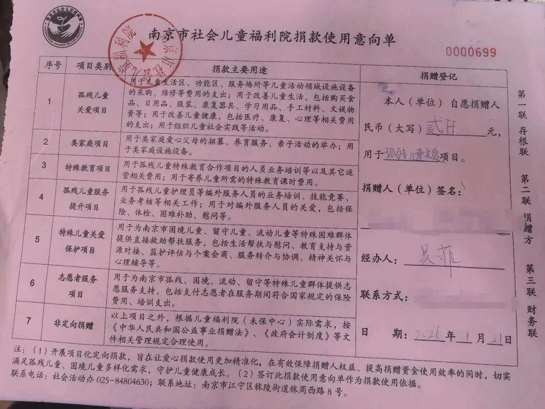 在填写“捐款使用意向单”时,他郑重地选择了“孤残儿童关爱项目”,将两千元奖金定向捐赠。