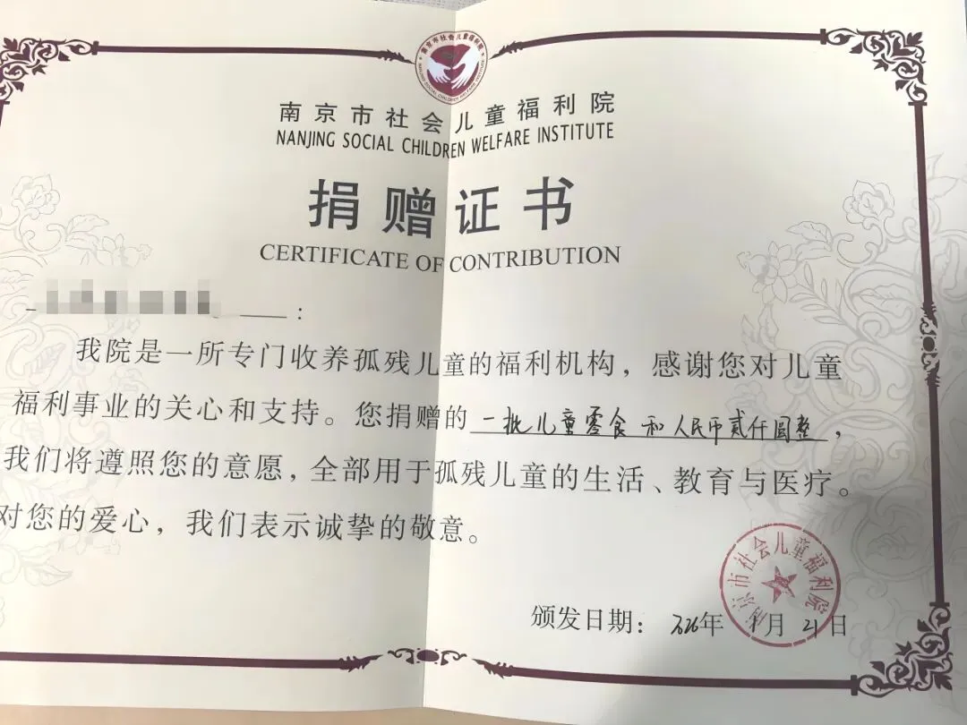 福利院颁发的捐赠证书上这样写道:“感谢您对儿童福利事业的关心和支持……对您的爱心,我们表示诚挚的敬意。”这张证书,颁发给了一个家庭。