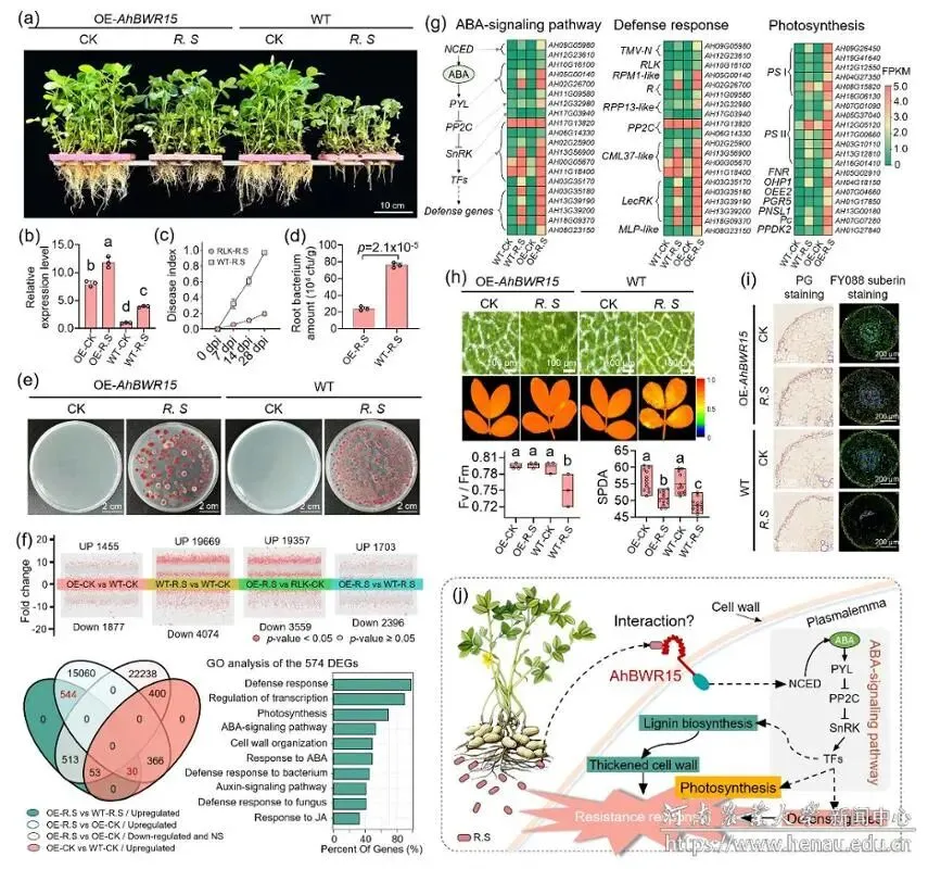 序列分析显示,AhBWR15第一个外显子1216 bp处存在G>A非同义突变,导致第618位氨基酸由甘氨酸(G)替换为天冬氨酸(D),该位点位于跨膜结构域(TM)和丝氨酸/苏氨酸激酶结构域(STK)之间。对238份花生自然种质资源的基因型检测表明,该突变仅存在于H108及其RIL中。单倍型分析显示,151个RIL群体中64%的抗病株系携带抗病单倍型(Hap-R),76%的感病株系携带感病单倍型(Hap-S)。通过发根农杆菌介导的花生毛状根转化获得AhBWR15过表达植株,证明过表达AhBWR15能够显著提升花生青枯病抗性。进一步表达谱分析表明,AhBWR15通过促进与脱落酸信号相关的防御反应以及维持细胞壁结构和高效的光合作用,使植株增强了抗青枯病的能力。