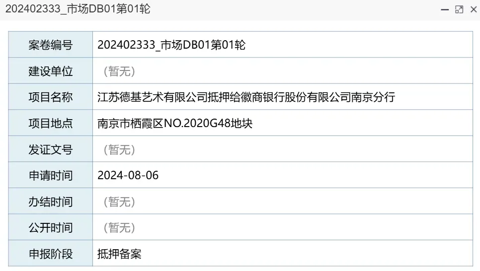 直到2024年8月份,南京规划局一份抵押备案申报,让这个项目重回大众视野,G48地块,江苏德基艺术有限公司抵押给徽商银行股份有限公司南京分行。