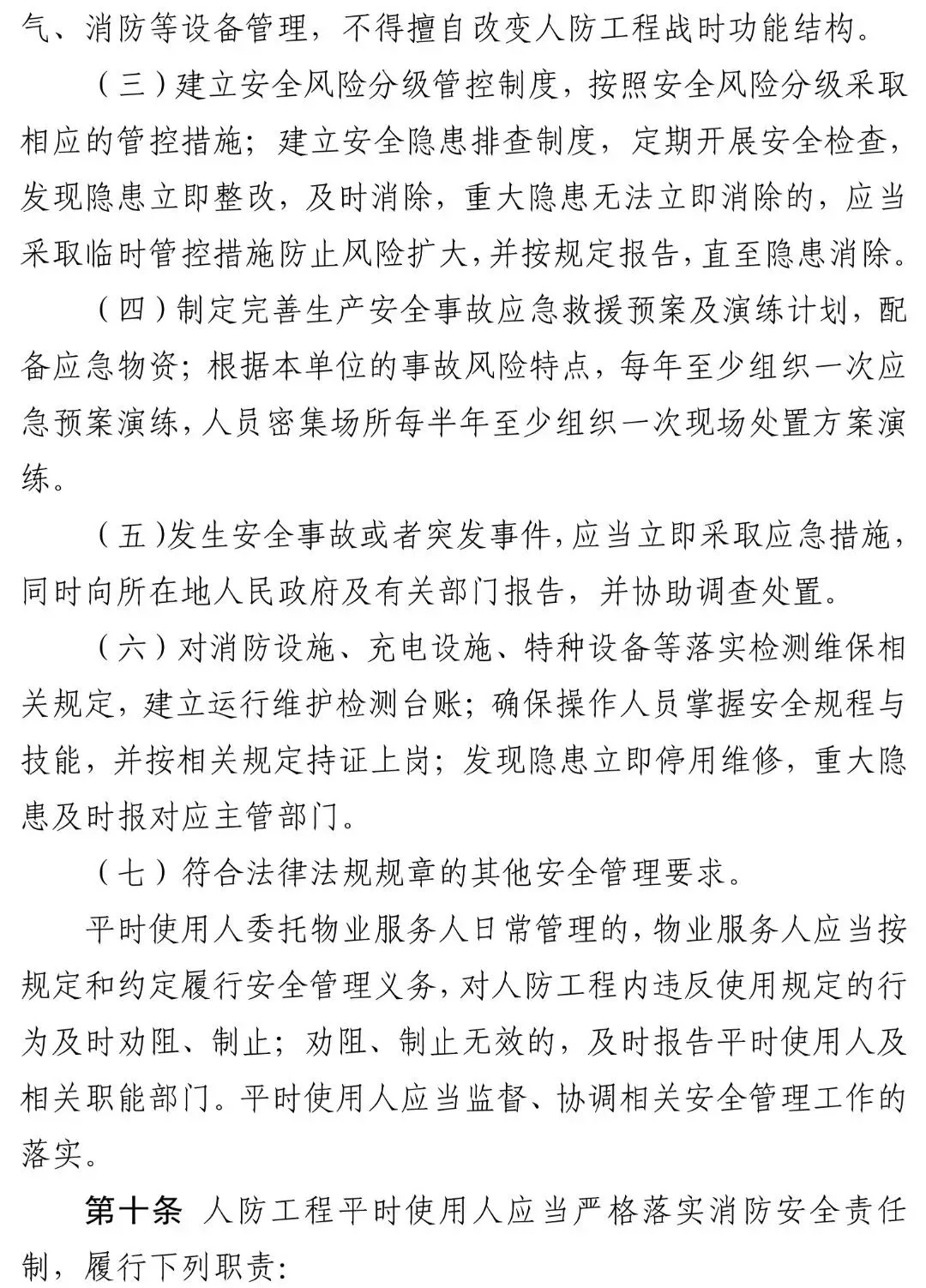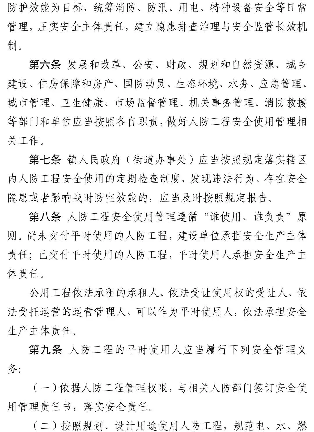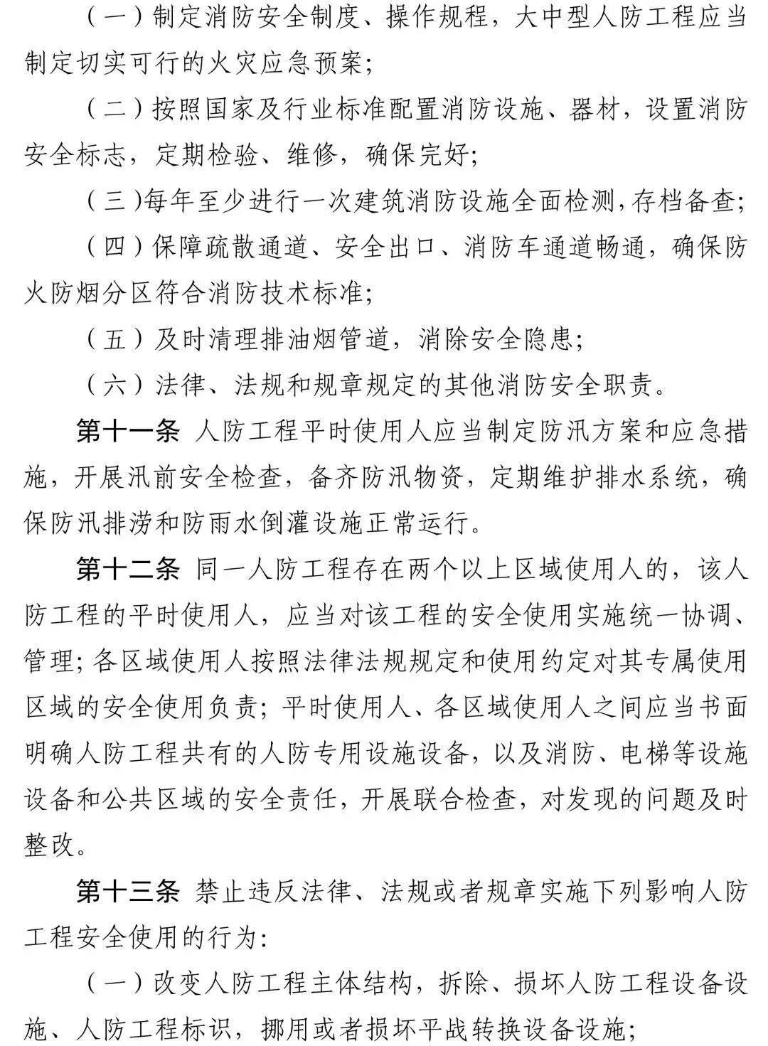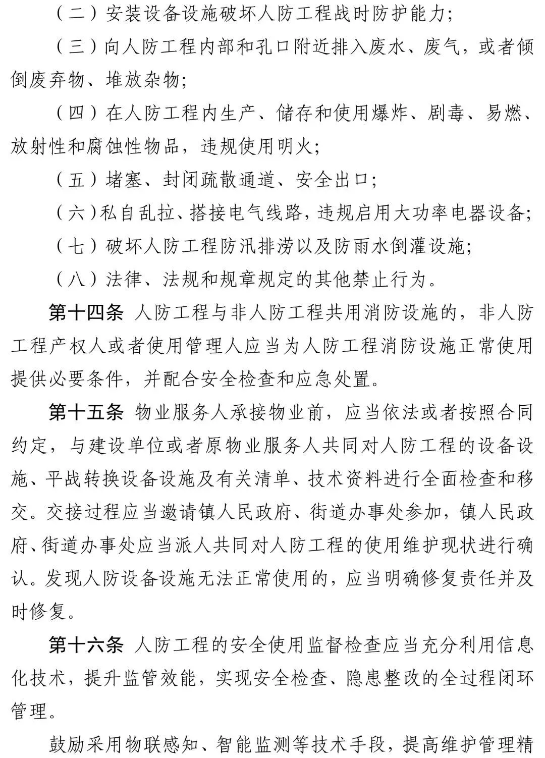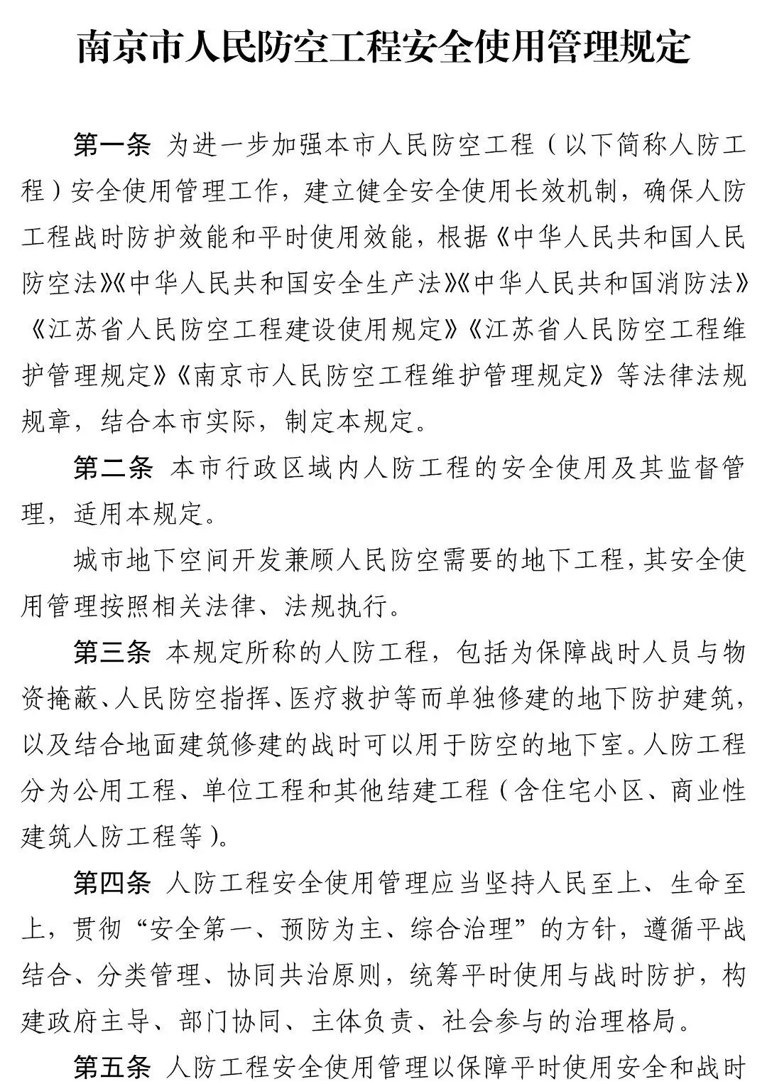 《南京市人民防空工程安全使用管理规定》正式颁布,自2026年1月20日起施行。新规结合南京实际,衔接国家及省相关要求,明确 “谁使用、谁维护” 责任体系,强化安全管控与使用流程规范,全面压实各方责任、筑牢安全防线,确保人防工程 “平时能用、战时管用”,为战时防空、平时服务、应急支援提供坚实法治保障。