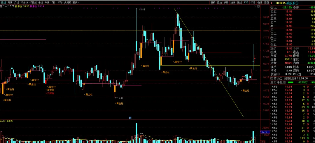 2026年2月27日,A股市场整体震荡整理,航运港口板块逆势走强(当日涨幅1.47%),主力资金净流入1.38亿元,为板块内个股提供情绪支撑。在此背景下,盛航股份(001205.SZ)依托缩量支撑,走出窄幅震荡企稳走势,贴合板块整体节奏。今日该股以16.94元开盘,盘中最高触及17.09元,最低下探至16.76元,最终收盘于16.95元,上涨0.13元,涨幅0.77%,振幅1.96%。全程依托黑马王子量学核心逻辑,仅做量价分析,同步结合当日市场新闻、行业动态,解读走势背后的量能信号与市场逻辑,适配普通投资者阅读。