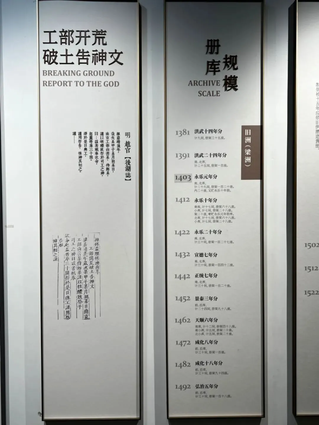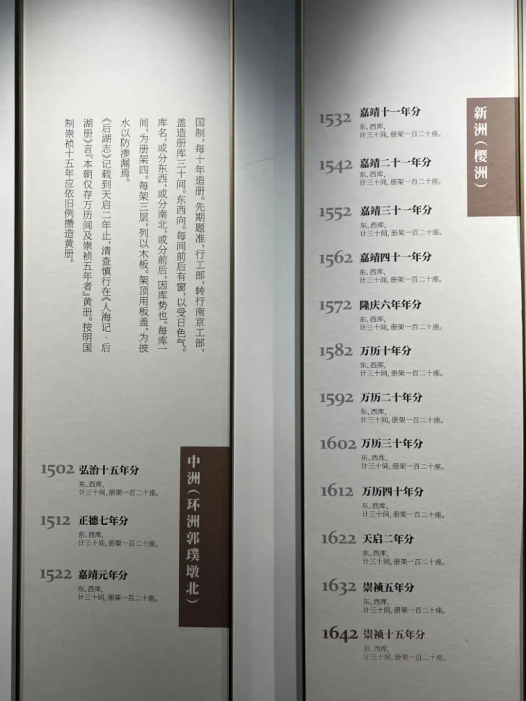 [5]展馆“册库规模”展区显示,明代大造黄册共27次,具体存放情况如下:“旧洲(梁洲)”库房,存放的是洪武十四年(1381年)、洪武二十四年(1391年)、永乐元年(1403年)、永乐十年(1413年)、永乐二十年(1423年)、宣德七年(1432年)、正统七年(1442年)、景泰三年(1452年)、天顺六年(1462年)、成化八年(1472年)、成化十八年(1482年)、弘治五年(1492年)等年份的黄册,共12次;“中洲(环洲郭璞墩北)”库房,存放的是弘治十五年(1502年)、正德七年(1512年)、嘉靖元年(1522年)等年份的黄册,共3次;“新洲(樱洲)”库房,存放的是嘉靖十一年(1532年)、嘉靖二十一年(1542年)、嘉靖三十一年(1552年)、嘉靖四十一年(1562年)、隆庆六年(1572年)、万历十年(1582年)、万历二十年(1592年)、万历三十年(1602年)、万历四十年(1612年)、天启二年(1622年)、崇祯五年(1632年)、崇祯十五年(1642年)等年份的黄册,共12次。