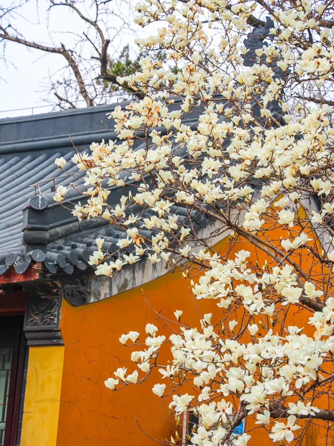 一场雪后,古寺与玉兰最是绝配。洁白花瓣映着黄墙黛瓦,不用刻意构图,随手就是一幅中式水墨画。