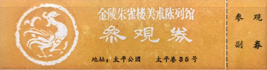 该门票横版,单色套印,左边是朱雀瓦当图(瓦当是古代建筑屋面筒瓦顶端下垂的部分,用来保护屋檐),中间是金陵朱雀楼美术陈列馆字样,下方是地址太平公园,右边是副券。门票印制了二种颜色,算是套票。