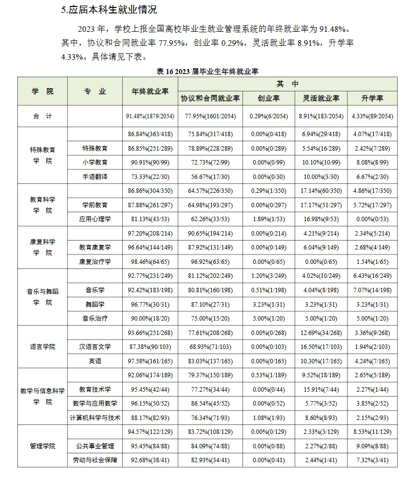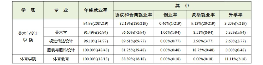 2023年,学校上报全国高校毕业生就业管理系统的年终就业率为91.48%。其中,协议和合同就业率77.95%,创业率0.29%,灵活就业率8.91%,升学率4.33%。