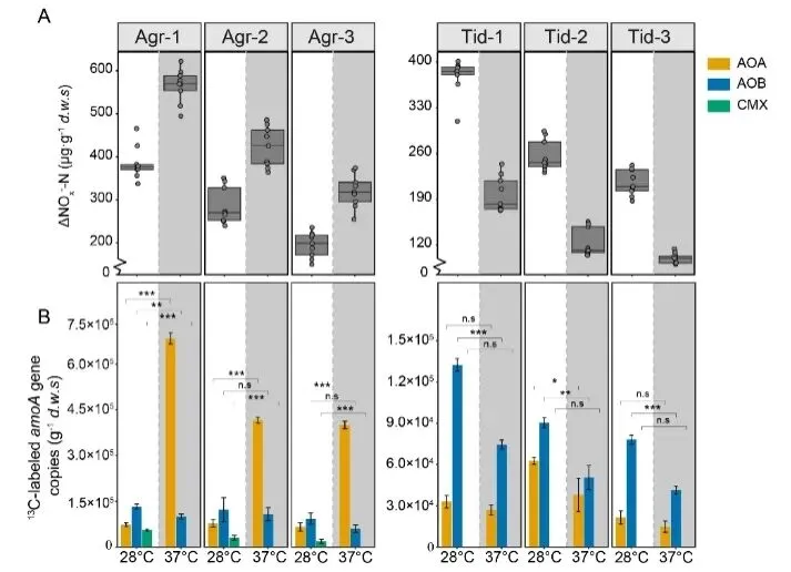 研究发现,持续高温对不同类型土壤中的活性硝化微生物产生了差异化影响。在潮滩土壤中,热浪显著抑制了活性氨氧化古菌(AOA)、氨氧化细菌(AOB)以及完全氨氧化菌(CMX)的丰度,并驱动活性硝化类群从适应海洋环境的生态型向耐热性更强但耐盐性较弱的陆地生态型演替;而在农田土壤中,高温虽然抑制了活性AOB,却意外促进了耐热性陆地AOA生态型的增殖。这种土地利用类型依赖的响应模式,揭示了生态系统对气候胁迫的复杂适应机制。