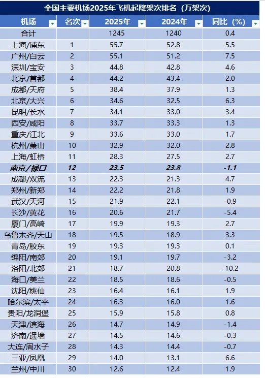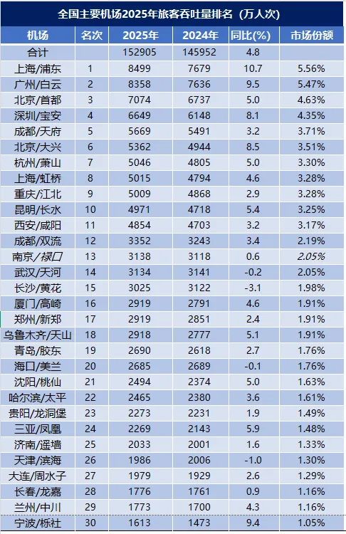 得益于武汉、长沙的倒退,南京机场得以在2025年“躺赢”,相对排名上升两位,整体市场份额约为2.05%