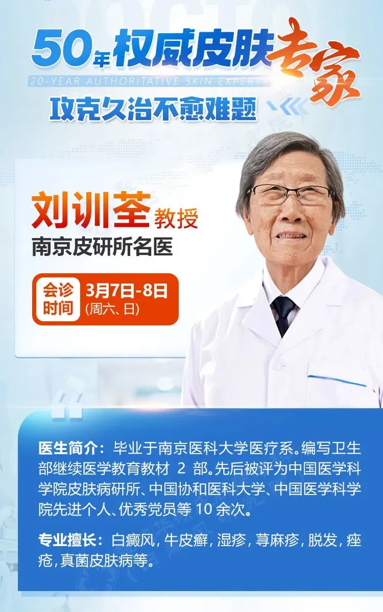 以全年耕耘,换时节安康2026年3月7日—3月8日(周六日)中国医学科学院南京皮肤病研究所 刘训荃教授 亲临盐城家门口的南京专家,看得见的优质医疗