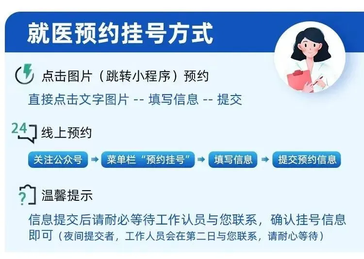 预约就诊提示:为缩短现场等待时间,同时保障每位就诊者的健康与安全,实行预约就诊制,请您提前预约并按约定时间前来。