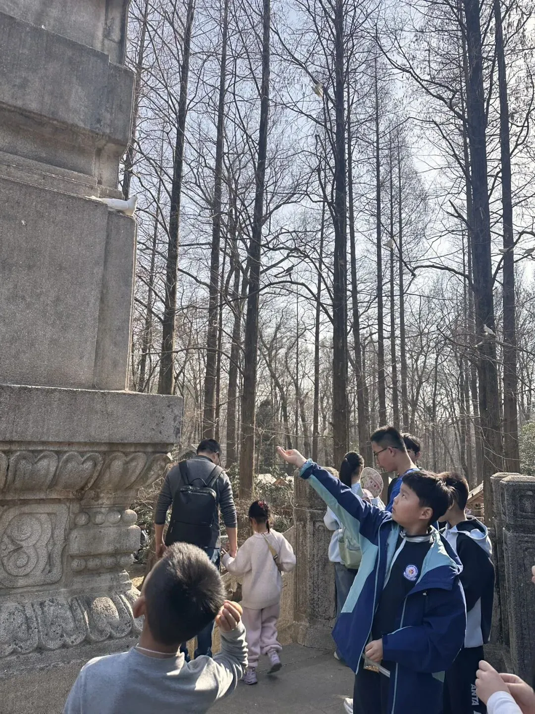 小福倒是不在意这些。他眼里只有一只偶尔踱步出来的鸽子,追着它满场跑。鸽子飞上台阶,他就爬上台阶;鸽子飞到石雕塔上,他也不气馁,踮起脚尖把手里的谷物举得高高的,把食物放在手心,高高举起,静静地站着等待。儿子的眼神专注而天真,像个虔诚的小信徒。