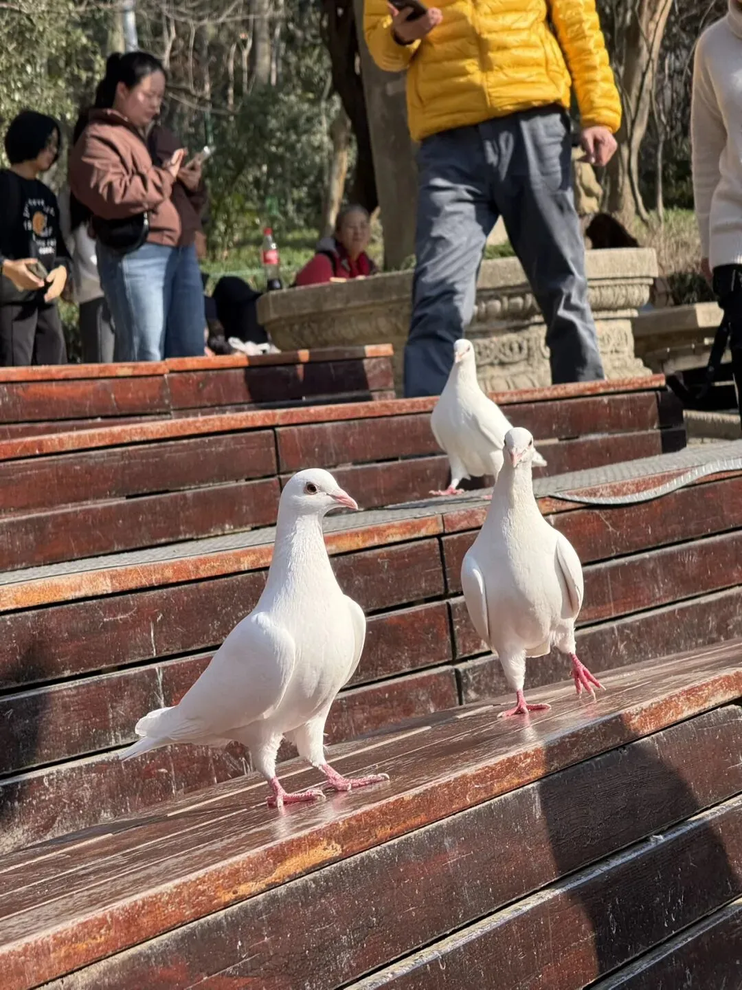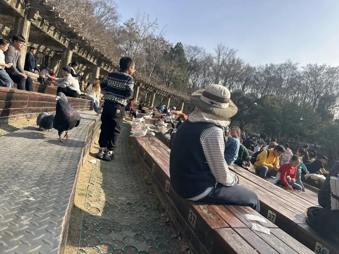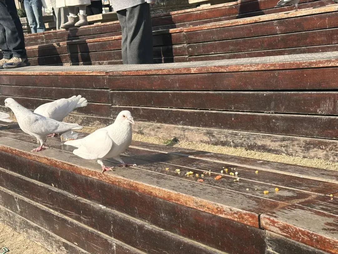 手机里刷过无数次别人拍的视频:鸽群忽啦啦腾空而起,绕着音乐台盘旋,遮天蔽日;游客坐在台阶上,鸽子就落在膝盖上、肩膀上,甚至手心里啄食。那画面,简直像是童话里的场景。