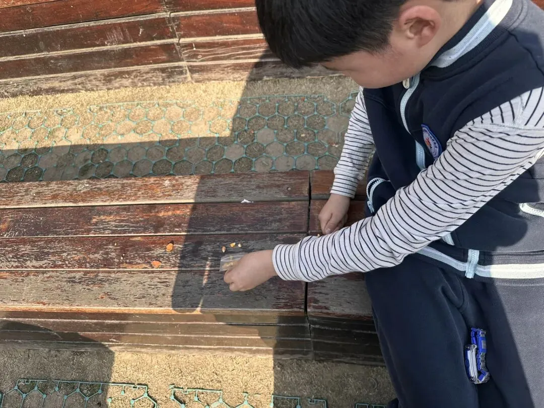 小朋友们静悄悄地把食物撒在凳子上,生怕吓到鸽子。鸽子们也不怕人,三三两两凑过来,低着头啄食,尾巴一翘一翘的。有几只胆大的,直接跳到小朋友腿上,歪着脑袋等投喂。