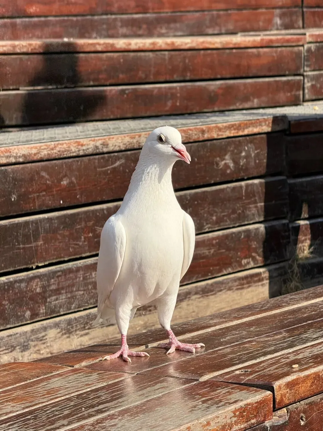 原来这里才是鸽子的“宿舍区”——一排排整齐的木制鸽笼,鸽子们都在窝里待着呢,压根没打算出来上班。