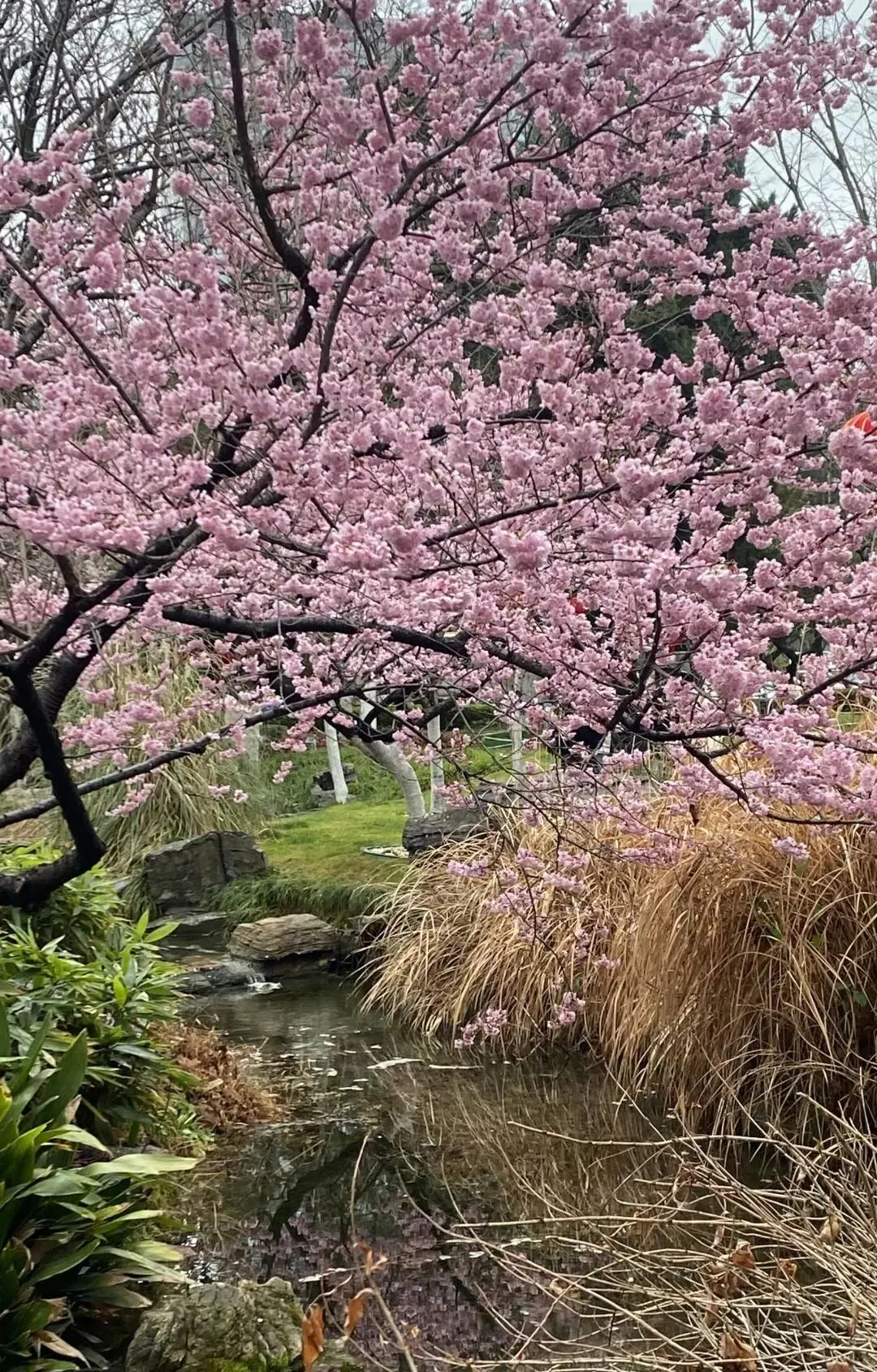 🏛️从大门进去,先跟那17米高的和平公园钟楼打个招呼,这座三层高的民国建筑见证了无数个春夏秋冬。后往西园走,这里有一条整治后新生的樱花溪。溪水边种植的“牡丹樱” 和“初美人” 开得正艳,花瓣飘落在水面上,随波逐流,真的有一种“花自飘零水自流”的意境。
