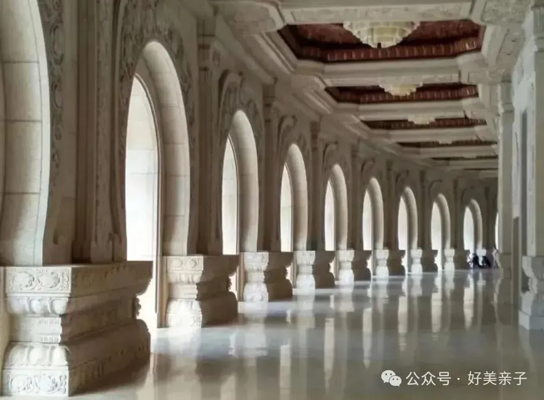 美仑美奂的环形长廊。长廊内侧有31幅壁雕,有四幅经变图,八幅不同语种的心经, 15幅中华名寺浮雕,另外还有金陵四景的浮雕,分别是:牛首山、紫金山、玄武湖与秦淮河。