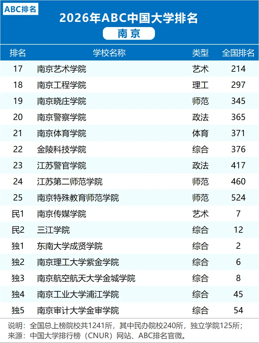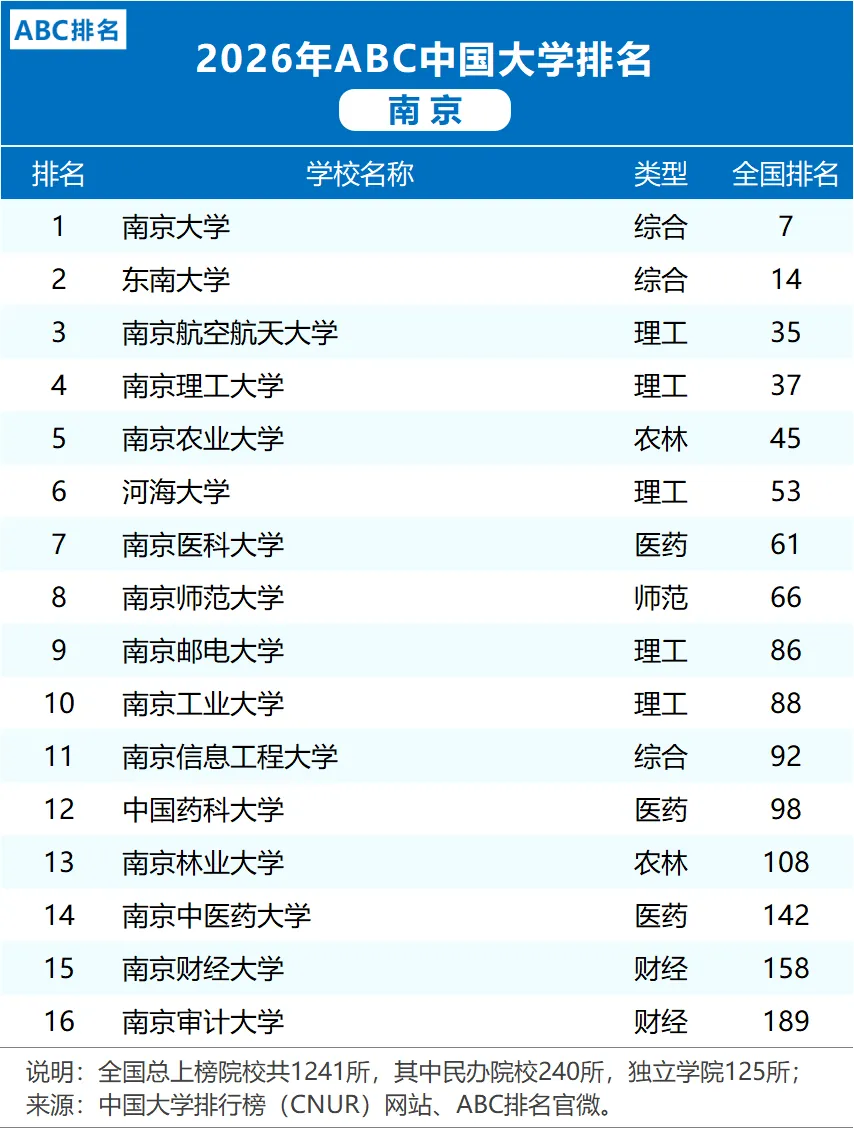 >2026年南京市大学排名一览表