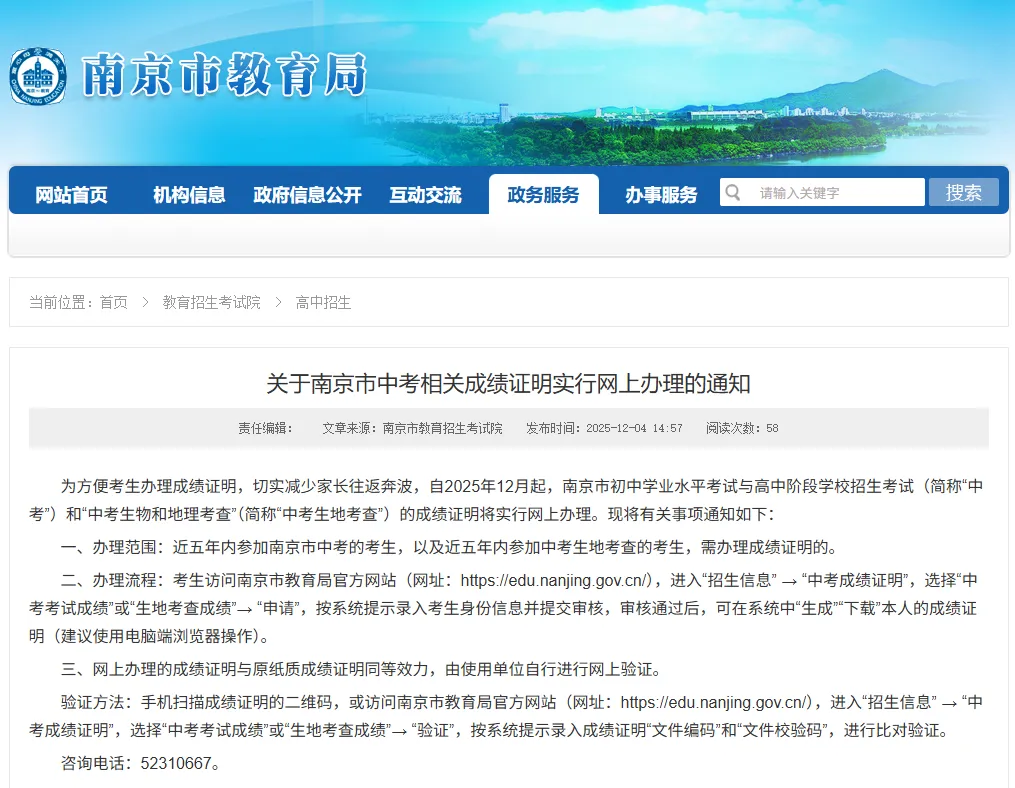 为方便考生办理成绩证明,切实减少家长往返奔波,自2025年12月起,南京市初中学业水平考试与高中阶段学校招生考试(简称“中考”)和“中考生物和地理考查”(简称“中考生地考查”)的成绩证明将实行网上办理。现将有关事项通知如下: