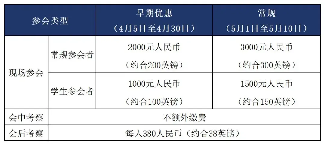 注册费含参会许可、会议材料、场地租用、会间用餐、会中考察。会议住宿及交通费用自理。会后考察费用含会场与考察地的往返交通、专业讲解、简餐,缴费时需与注册费一并缴纳。不接受现场缴费。