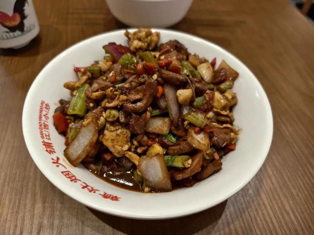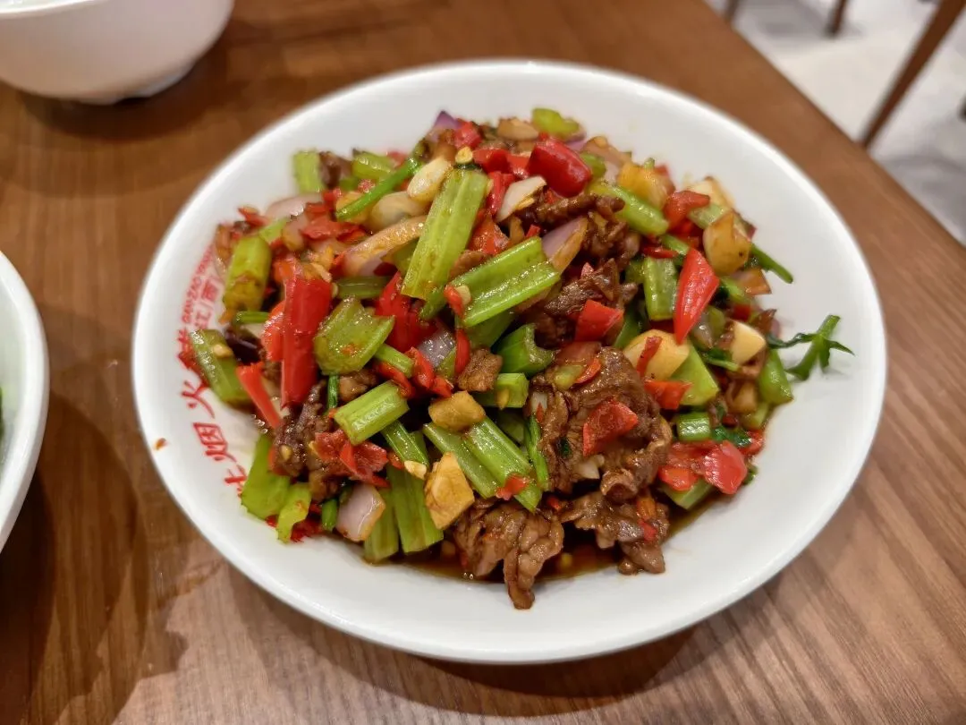 很像湘菜里的小炒黄牛肉,辅料主要是芹菜,牛肉应该用淀粉浆过,还挺嫩的,很喜欢湘赣小炒的原因就是,它们虽然每道菜都挺辣,但细吃起来又不是一种辣,比如上一碗的鸡杂就是很复合的辣,而这碗牛肉的辣就是带点咸鲜的辣,辣度更高一些,一样的下饭。