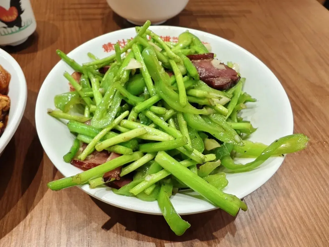 想着点个素菜吧,没想到还挺好吃的,芦蒿鲜绿鲜绿的,非常新鲜,份量也多,配菜的腊肉也很香。