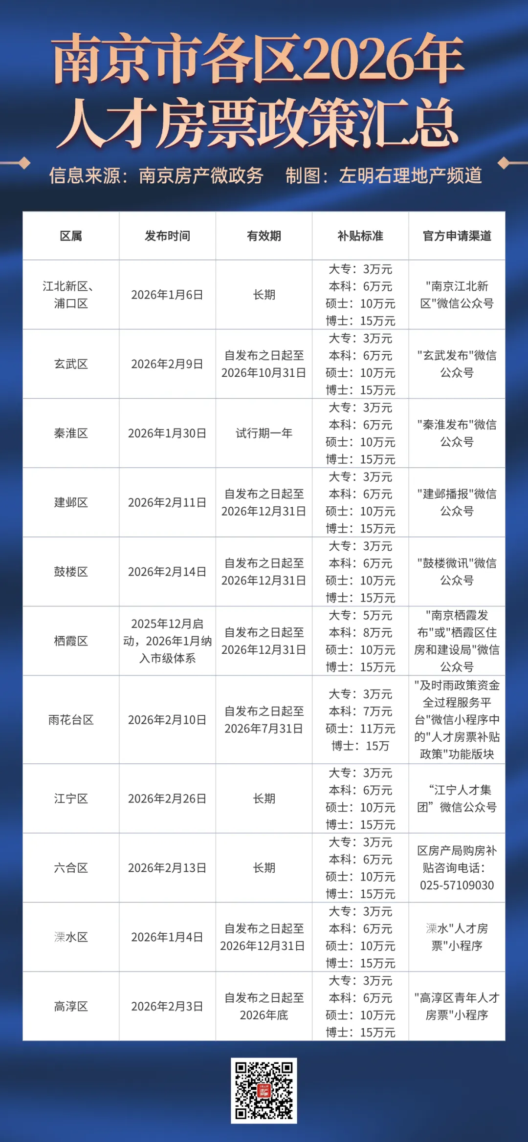 南京这轮人才房票,市级标准是博士15万、硕士10万、本科6万、大专3万。各区为了抢人,直接开启“加码模式”(我们先简要地拎下特点,具体政策文末附表)——