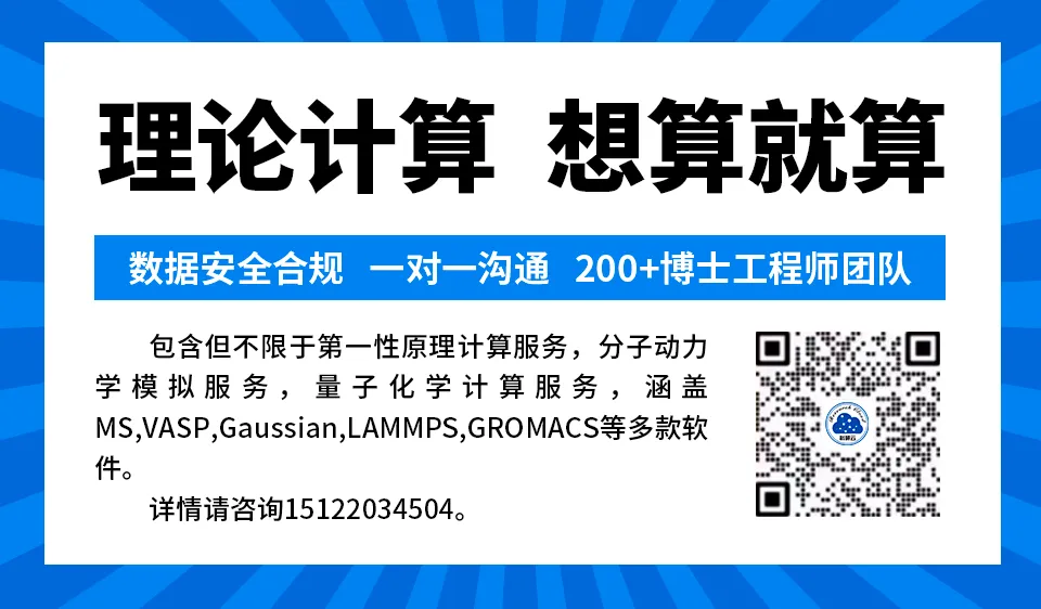 科研云是专业的理论计算解决方案服务商,服务包含但不限于第一性原理计算服务(电化学催化,固体热催化,电池体系,表面吸附,电子结构分析),分子动力学模拟服务(理化性质,几何结构,相互作用,扩散过程,第一性分子动力学),量子化学计算服务(均相催化,谱图模拟,HOMO-LUMO gap,几何性质,电子/磁性质,反应活性位点预测,分子相互作用),涵盖MS,VASP,Gaussian,LAMMPS,GROMACS等多款软件,保障计算数据安全合规,为您提供最优解决方案,服务用户研究成果已发表多种国际顶级期刊,详情请咨询15122034504。