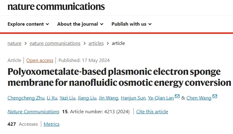 Chengcheng Zhu, Li Xu, Yazi Liu, Jiang Liu, Jin Wang, Hanjun Sun, Ya-Qian Lan & Chen Wang. Polyoxometalate-based plasmonic electron sponge membrane for nanofluidic osmotic energy conversion. Nat Commun 15, 4213 (2024).