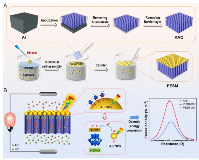 海水和河水之间的盐度梯度产生的巨大渗透能是一种极具潜力的蓝色能源,可以通过反向电渗析(RED)提取,通过透选择膜在电极之间选择性地传输离子。作为RED的核心组件,透选择膜在纳米流体渗透能量收集中起着基础作用。纳米流体膜在收集渗透能方面显示出巨大的潜力。然而,输出功率密度通常受到膜选择性不足的阻碍。在此,本文设计了一种基于多金属氧酸盐(POMs)的纳米流体等离子体电子海绵膜(PESM),用于高效渗透能量转换。在光的照射下,Au NPs表面产生热电子,并将热电子转移储存在POMs电子海绵中,而热空穴则被水消耗。存储在POMs中的热电子增加了PESM的电荷密度和亲水性,从而显著提高了高性能渗透能转换。
