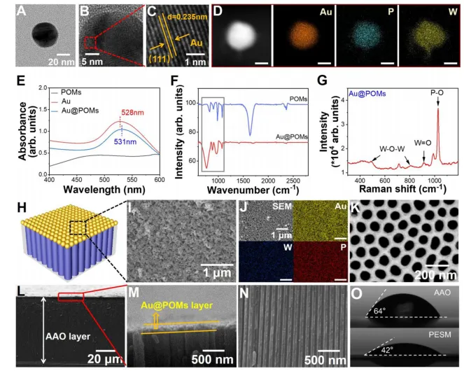 通过透射电镜(TEM)表征,将还原后的聚甲醛(POMs)与柠檬酸稳定的金纳米粒子(Au NPs)在水中混合合成Au@POMs。由于在TEM成像中W元素的良好对比,可以观察到围绕Au NPs的环状POMs(图2A和补充图3)。通过高分辨率透射电子显微镜(HRTEM)图像分析Au@POMs,相邻的两个晶格面间距约为0.235 nm,这与立方体Au(111)面的间距非常吻合(图2B, C)。高角度环形暗场扫描透射电子显微镜(HAADF-STEM)图像(图2D)清楚地表明Au@POMs NPs具有典型的核壳结构。能量色散x射线(EDX)元素映射进一步表明,Au元素仅分布在核中,而POMs的P和W元素均匀分布在整个NP中,表明Au NP核被均匀的POMs壳层包围。