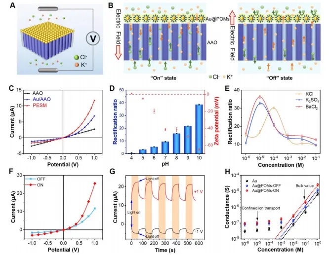 为了了解跨膜离子传输的性质,将PESM夹在自制的电化学电池中,采用两个Ag/AgCl电极记录离子电流(图3A和补充图15)。目前的PESM具有典型的离子电流整流(ICR)特性,这是由不同电位偏压下离子耗尽或积累引起的。