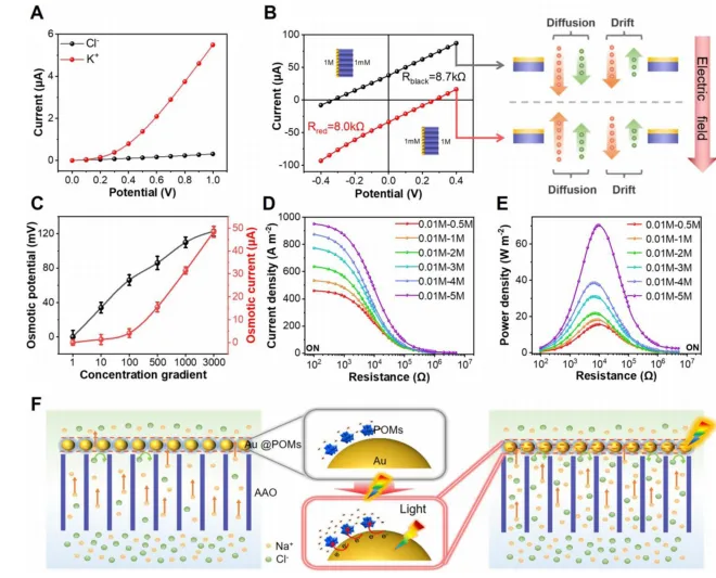 为了研究渗透能转换性能,将PESM放置在测量面积为~0.03 mm2的电化学电池中。在PESM的两侧加入两种不同浓度的电解质,以确认阳离子选择性(图4A)。为了寻找离子传输的最佳方向,在两种不同盐浓度的梯度下测量了I-V曲线(图4B)。当AAO侧浓度为1 M (CH), Au@POMs侧浓度为1 mM (CL) KCl时,纳米膜的内阻仅为8 KΩ(红线)。更低的电阻保证了更好的渗透性。