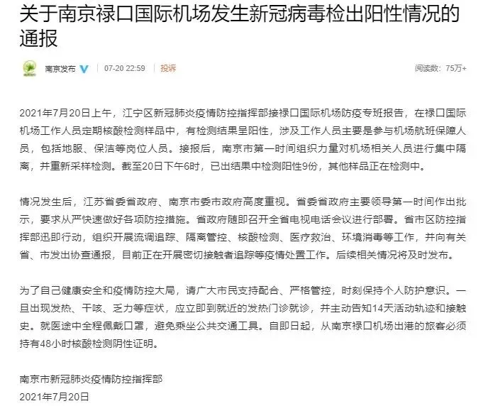 7月20日,江苏省南京市江宁区新冠肺炎疫情防控指挥部接禄口国际机场防疫专班报告,在禄口国际机场工作人员定期核酸检测样品中,有检测结果呈阳性,接报后,南京市第一时间组织力量对机场相关人员进行集中隔离,并重新采样检测。