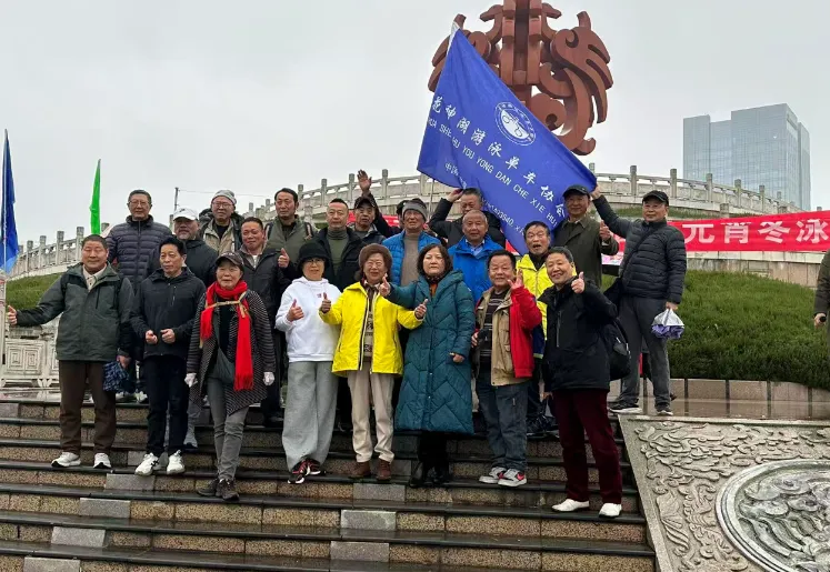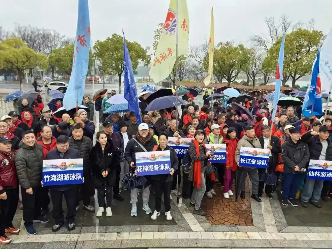 虽然立春已经过了二十多天,但当日的金陵依旧被“倒春寒”笼罩,细雨绵绵,气温维持在10度左右,湿冷的寒风裹挟着水汽,给冬泳活动增添了不小的挑战。然而,低温与细雨丝毫没有浇灭冬泳爱好者们的热情,活动现场暖意融融、氛围热烈,队员们个个精神抖擞、摩拳擦掌,有序进行热身运动,拉伸、活动关节、互相鼓劲,脸上洋溢着自信与期待,尽显冬泳健儿的豪迈与洒脱。