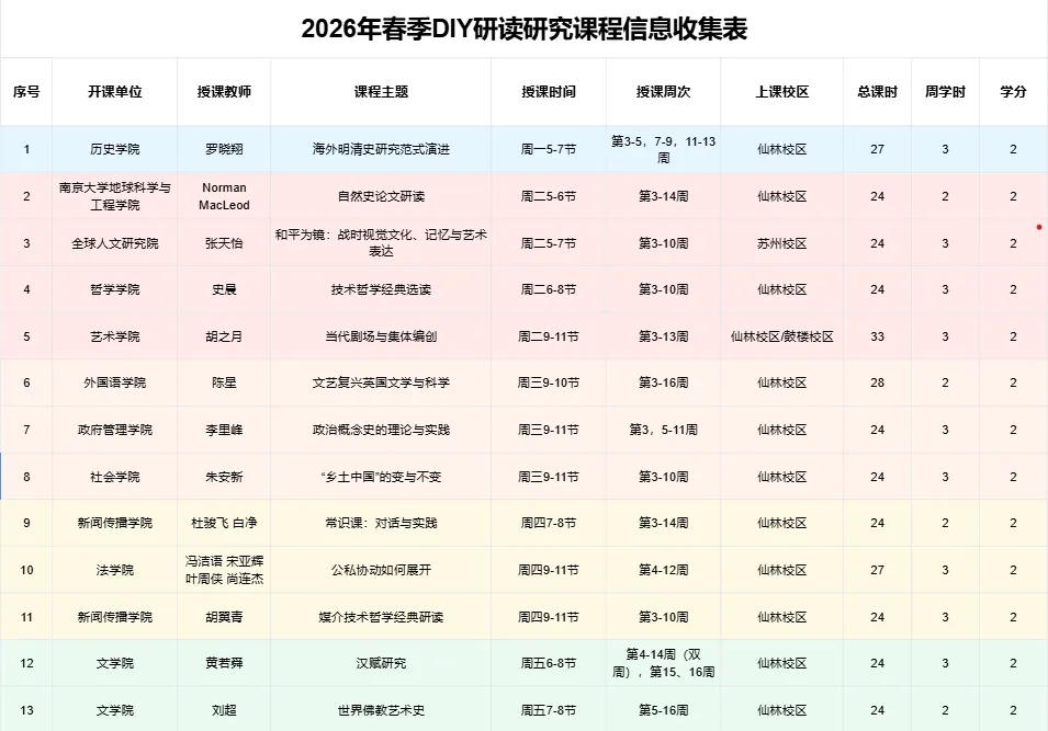 1.请同学们查阅选课说明及“灯下漫谈”公众号所发布的课纲推文,根据自己学术兴趣与时间安排,选择合适的课程。