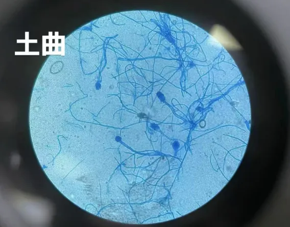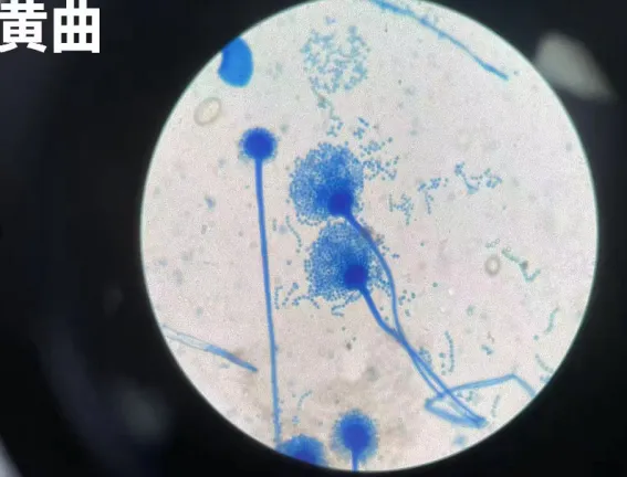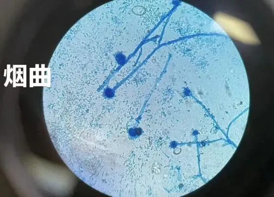 丝状真菌的鉴定以菌落形态和镜检特征为主要依据,通过观察真菌的菌落的生长速度、颜色、大小、形态,挑取菌落进行镜下形态观察,根据菌落和镜下特征,确定菌种。曲霉属在镜下找到分生孢子头,观察顶囊形状、梗基进行鉴定,常见的有黄曲霉、黑曲霉、土曲霉、烟曲霉。烟曲霉镜下特征是顶囊呈烧瓶状或似棒状,小梗是单层,开始菌落呈白色,3-4d菌落中心变为烟绿色;黄曲霉梗壁粗糙,顶囊呈球形,分生孢子头呈松散放射状;黑曲霉呈双层小梗满轮,球形大顶囊;土曲霉呈半球形或烧瓶状顶囊,分生孢子头呈长而紧密状。