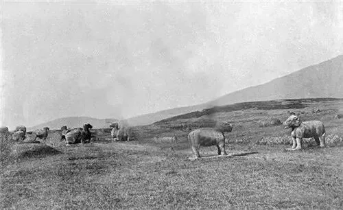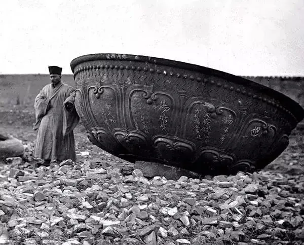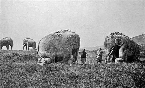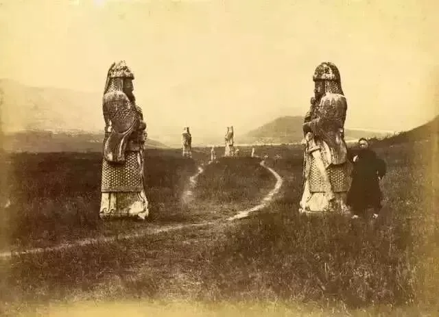 清末,南京大报恩寺遗址,一名僧侣站在被毁的大报恩寺建筑构件的旁边。清末,明孝陵神道上的翁仲路段。