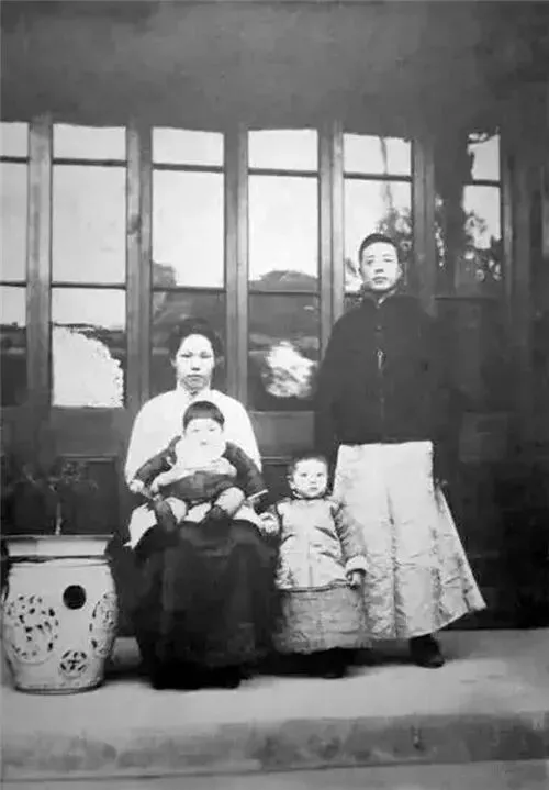 1914年,南京金陵中学,校长刘靖夫和太太、儿子、女儿在家中的合影照。
