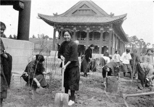 1923年,南京金陵女子大学,植树节上的大一新生。